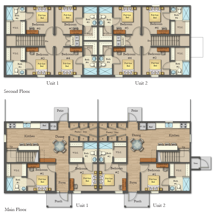 On-site parking, private bathroom in each suite, private pantry closet for each guest, and first- and second-floor laundry available.